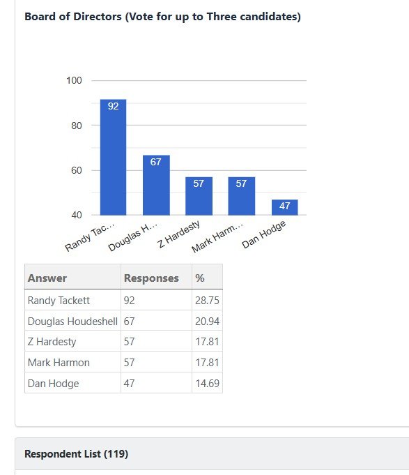 *There was a tie for the third board position between Z Hardesty and Mark Harmon. The tie breaker was settled by the OVR members attending the Elections Socializer with Z Hardesty winning the tie breaker.